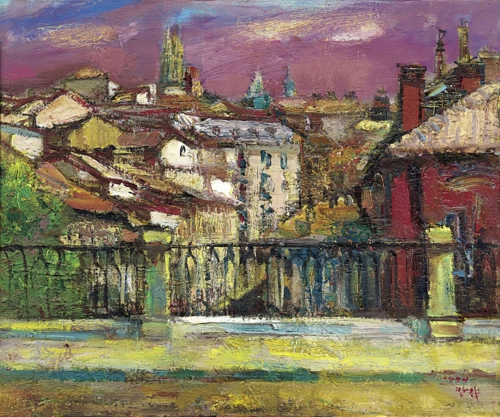 油彩 畫布 1994 簽名右下:1994 哲哉 簽名畫背:8F 橋邊遠 沈哲哉 38×45cm (14.9×17.7 in.)
