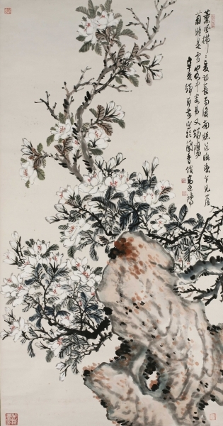 高逸鴻(1908-1982) Gau Yi Hung 白玉蘭花 設色紙本 立軸 1971年作 款識:薰風拂拂夏初長,雨後南窗送晚涼,乍見薝葡疑是雪,客中容易又端陽。辛亥端節前寫於蘭香館,高逸鴻。 鈐印:到處十枝五枝花(朱文)、臨安高氏(白文)、逸鴻書畫(朱文)、蘭香館書畫記(白文)、王子步書畫珍藏(朱文)。 176x93 cm.